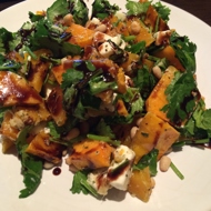 Combine the pumpkin with feta, ginger, and cilantro, season with salt to taste, sprinkle with nuts, and drizzle with balsamic sauce.