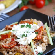 Divide the couscous into 4 small bowls, top with the roasted vegetables. Generously sprinkle with crumbled feta cheese.