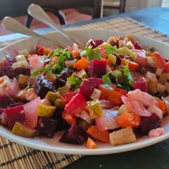 The essence of this vinaigrette lies in the fact that all the vegetables are prepared without water — they retain their juiciness, and the method of cutting them into large cubes allows you to experience the natural flavor of each vegetable. The dressing merely enhances their taste. And of course, there are no potatoes here, which significantly reduces the calorie content. This method will appeal to everyone, as the vegetables do not turn into mush.