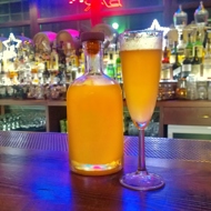 Pour the lower part into a bottle and chill. Serve in a frozen flute glass: pour 120 ml of the drink into the glass and top with 30 ml of sparkling water.