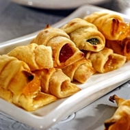 Roll out the dough to a thickness of 5 mm and cut into strips 5-7 cm wide. Cut the jam into sticks (about 3-5 cm long, depending on the width of the dough strip) and roll them in the dough.