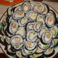 Place a strip of cucumber and a strip of crab stick (or fish) on the rice, spread the prepared sauce, and roll it up. Repeat for each sheet.