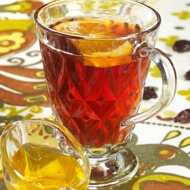 Pour the prepared drink into a cup, add honey, stir, and garnish with a slice of orange.