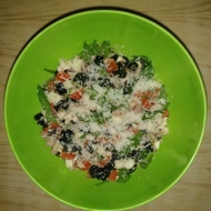 Then chop the cod liver and mozzarella finely, add the arugula, and mix all the ingredients together.