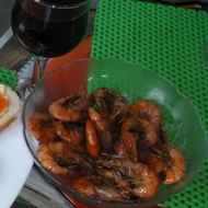 Place the shrimp in a hot skillet and sauté for five minutes without oil. Grate the garlic into the skillet using a fine grater and sauté for another three minutes with the garlic. Add 100 ml of wine, cover with a lid, and let the wine evaporate.
