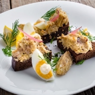 Pass the herring, muksun, smoked omul, sautéed onion, peeled baked apples, and soaked bread through a meat grinder.
