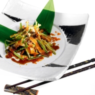 Cut the fried fish skin into small strips. Slice the cucumber into thin matchsticks. Mix both ingredients with tobiko (flying fish roe) and dress with unagi sauce.