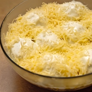 Boil the meat and slice it into strips. Arrange it on a plate as the second layer and spread mayonnaise on top. Finally, sprinkle this delicious dish with grated cheese.