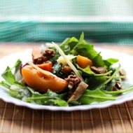 Place the washed salad greens in a deep bowl. Cut the tomatoes in half, slice the apricots into small wedges, and the dried figs into thin slices. Add to the salad greens and gently mix with your hands.