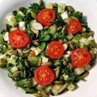 Mix thoroughly, sprinkle with pumpkin seeds, garnish with halved cherry tomatoes, and serve.