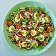 Cut the eggs in half and place them in the salad. Season with salt and pepper.