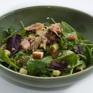 Place all the prepared ingredients in a dish, add the salad mix, and toss gently (the pieces of fish and liver should remain whole).