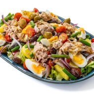 A modern take on the classic cod liver salad that was a staple at every gathering in the Soviet era. Instead of turning the liver and egg into a solid gray mass, we've lightened it with a heap of fresh greens. The classic vinaigrette dressing, olives, green beans, tomatoes, and finely chopped sprats combine to create a chorus of flavors that infuse the salad with Mediterranean notes, reminiscent of a Niçoise.