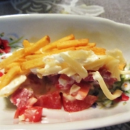 Then add grated cheese, more mayonnaise, and top with the fried potatoes.