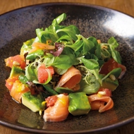 Arrange the dressed salad on a beautiful plate, then top it with avocado and slices of salmon.