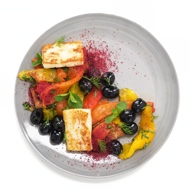 Salad with grilled halloumi, sweet peppers, and olives.
