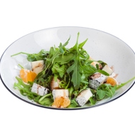 Pour a little sauce onto the bottom of the plate, place the arugula on top, then add pieces of cheese and mandarin. Season with salt and pepper to taste.