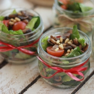 Garnish with 2 halves of cherry tomatoes and pine nuts.