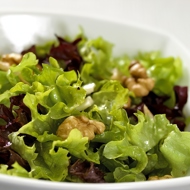 Tear or cut the lettuces into small pieces and transfer to a bowl. Add the dressing and mix well. Divide onto 2 plates and sprinkle with walnuts.