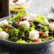 Crush the olives so they crack. Cut the cherry tomatoes in half. Arrange the salad greens and cherry tomatoes on plates, drizzling with the marinade from the cheese.