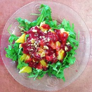 On a serving plate, place the arugula, chopped walnuts, and oranges cut into small pieces.