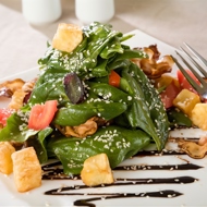 In a large bowl, combine the torn lettuce leaves, diced tomatoes, pancetta, and walnuts. Drizzle with the dressing and mix well. Then add the croutons and sprinkle with Parmesan shavings.