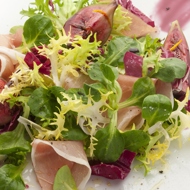 Mix the olive oil with the lemon juice and vinegar, whisking with a fork. Drizzle over the prosciutto and salad.