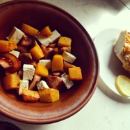 Place all the ingredients on a plate along with the warm pumpkin. Drizzle with olive oil and lemon juice. Optionally, add sweet grapes to taste. It pairs well with a piece of baguette.