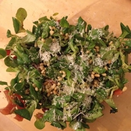 Take a bowl for the salad and place the corn salad (or arugula, or salad leaves, or spinach, or any other 'greens' that you like) into it.