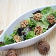 Cut the red radicchio into long strips and transfer to a bowl. Add the lettuce leaves and chopped chives. Cover and chill. Whisk the salad dressing again and drizzle over the salad. Toss well, add grated cheese and walnuts, mix again, and transfer to a serving bowl.
