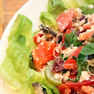 Tear the romaine lettuce by hand, slice the tomatoes into thin wedges, cut the leek into rings, and add the olives whole or sliced into rounds. Chop the basil, but not too finely, and leave a few leaves for garnish.