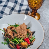 Remove the tough stems from the oyster mushrooms and slice them into strips. Sauté in a well-heated skillet with vegetable oil for 15–20 minutes, until the mushrooms release their moisture and become golden brown. At the end, season the mushrooms with soy sauce and remove from heat.