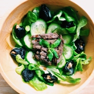 Slice the cucumber into thin rounds and place them on the lettuce leaves. Add the prunes, walnuts, meat, and drizzle with narsharab sauce. Garnish with a couple of sprigs of fresh basil.