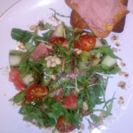 Assemble the salad, sprinkle with nuts, and season to taste with balsamic vinegar.