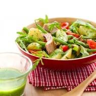 Trim the green beans. Boil the potatoes and add the beans to the boiling water one minute before the potatoes are done. Drain everything and rinse with cold water.