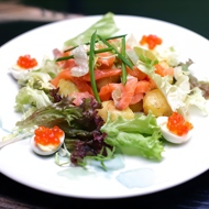 Slice the salmon fillet into thin pieces. Wash the lettuce, dry it, tear it by hand, and place half on a plate.