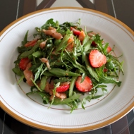 Slice the salmon into thin strips, halve the strawberries, and chop the celery stalks. Combine them in a large bowl with the arugula.