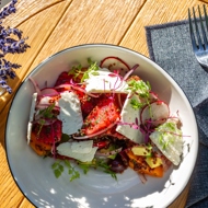 Coarsely chop the tomatoes and watermelon, removing the seeds from the watermelon. Slice the onion into feathers, cut the radishes into rings, dice the avocado into small cubes, and finely chop the parsley.