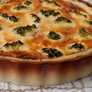 Place the broccoli and fish on the pie crust. Pour the egg and sour cream mixture over the filling and bake for 40–45 minutes.