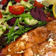 Marinate the salmon steak in pomegranate juice and spices (salt, allspice berries, freshly ground black pepper). Add a couple of lemon slices and let it sit for 30 minutes. Then place the fish on a 'bed' of onion, pour the marinade over it, and bake in the oven for 25–30 minutes.