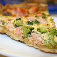 Grate the cheese on a coarse grater. In the prepared base, layer the cheese, then the salmon and broccoli. Pour the egg and cream mixture over everything. Bake the pie for 35 minutes at 200°C.