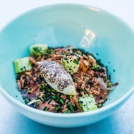 Wrap the onion in foil and roast it over the coals for 35 minutes. Finely chop the green onions and mix them with nori seaweed.