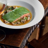 Salmon fillet in a green crust with mushroom sauce