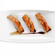 Preheat the oven to 356°F, line a baking tray with parchment paper, and arrange the marinated salmon slices on it. Place the tray with the salmon in the oven for 7 to 10 minutes, depending on your preferred level of doneness.
