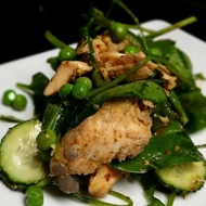Prepare the sauce: mix all the ingredients and whisk lightly until smooth. Arrange the lettuce leaves and spinach on a plate, top with broken pieces of salmon, peas, and cucumbers. Drizzle with sauce. Enjoy your meal!