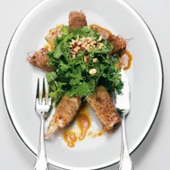 Cut the salmon fillet into 20 equal pieces. Season with salt and pepper. Wrap the fish in dough similar to that used for Eastern sweets. Fry for five minutes in the remaining butter.