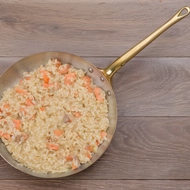 Pour in 70 ml of dry white wine and let it evaporate. Add hot broth to the rice so that the broth is level with the rice, and simmer gently, stirring constantly and adding more broth as it evaporates, for 18 minutes.
