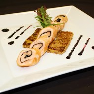 Salmon Roll on a Pancake Base with Oranges and Blueberry Ginger Sauce
