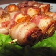 Remove the skin and bones from the fresh salmon (or trout). Cut into square pieces of equal size. Season with pepper, drizzle with lemon juice, and sprinkle with rosemary. No need to add salt, as the bacon is already salty enough.