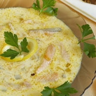 Cut the salmon fillet into cubes. Add to the soup and bring to a boil. Cook for 5–7 minutes until the fish is done. Add salt and cilantro.